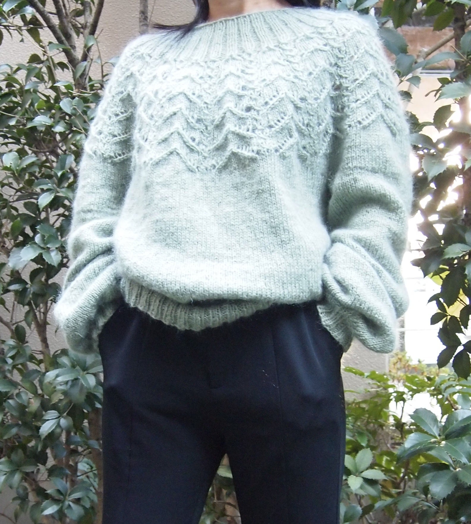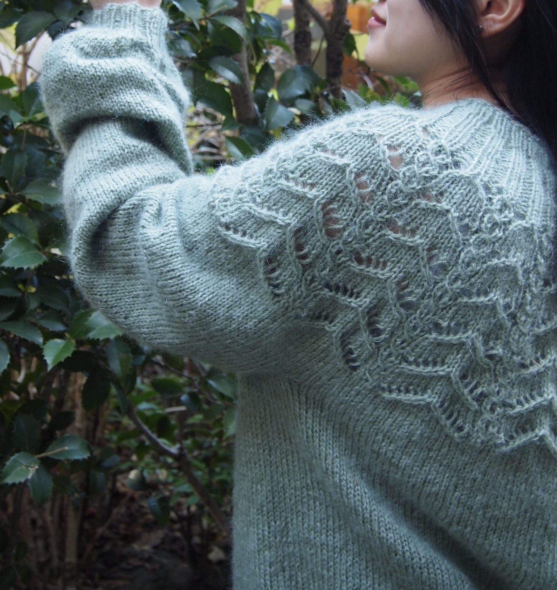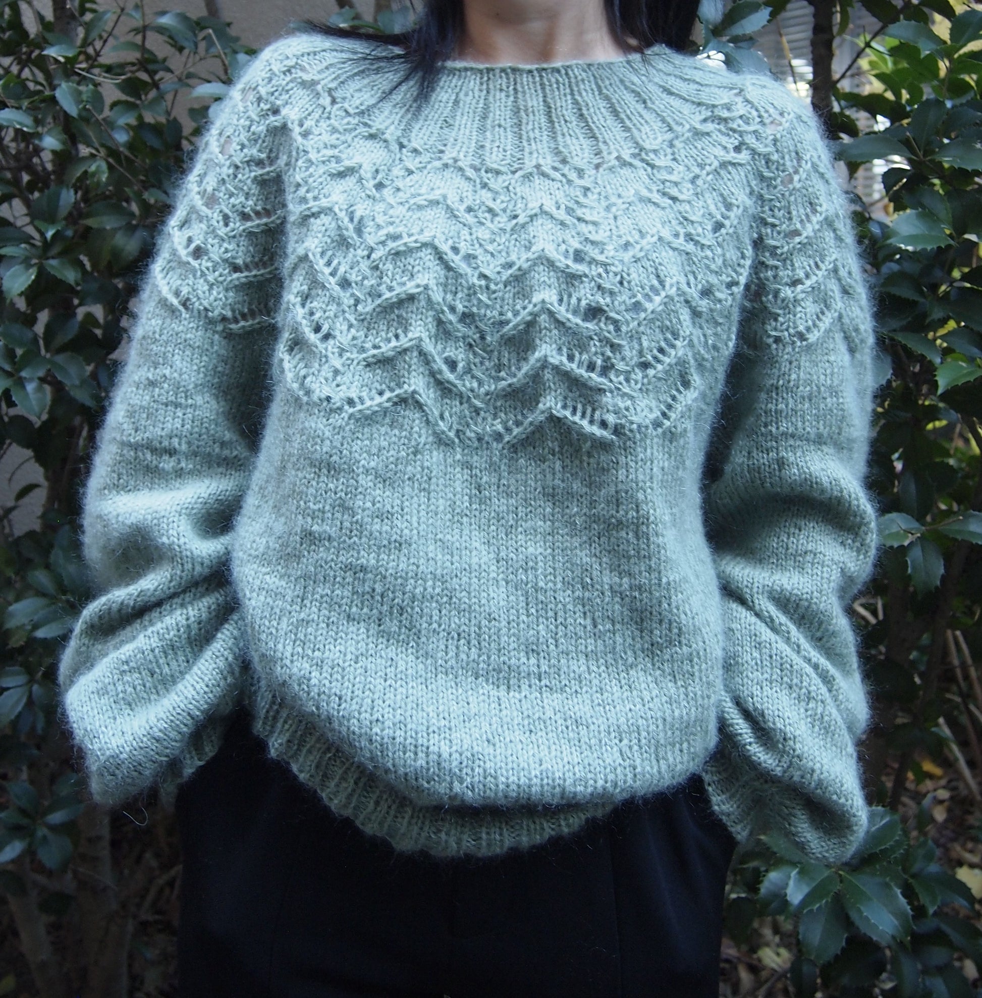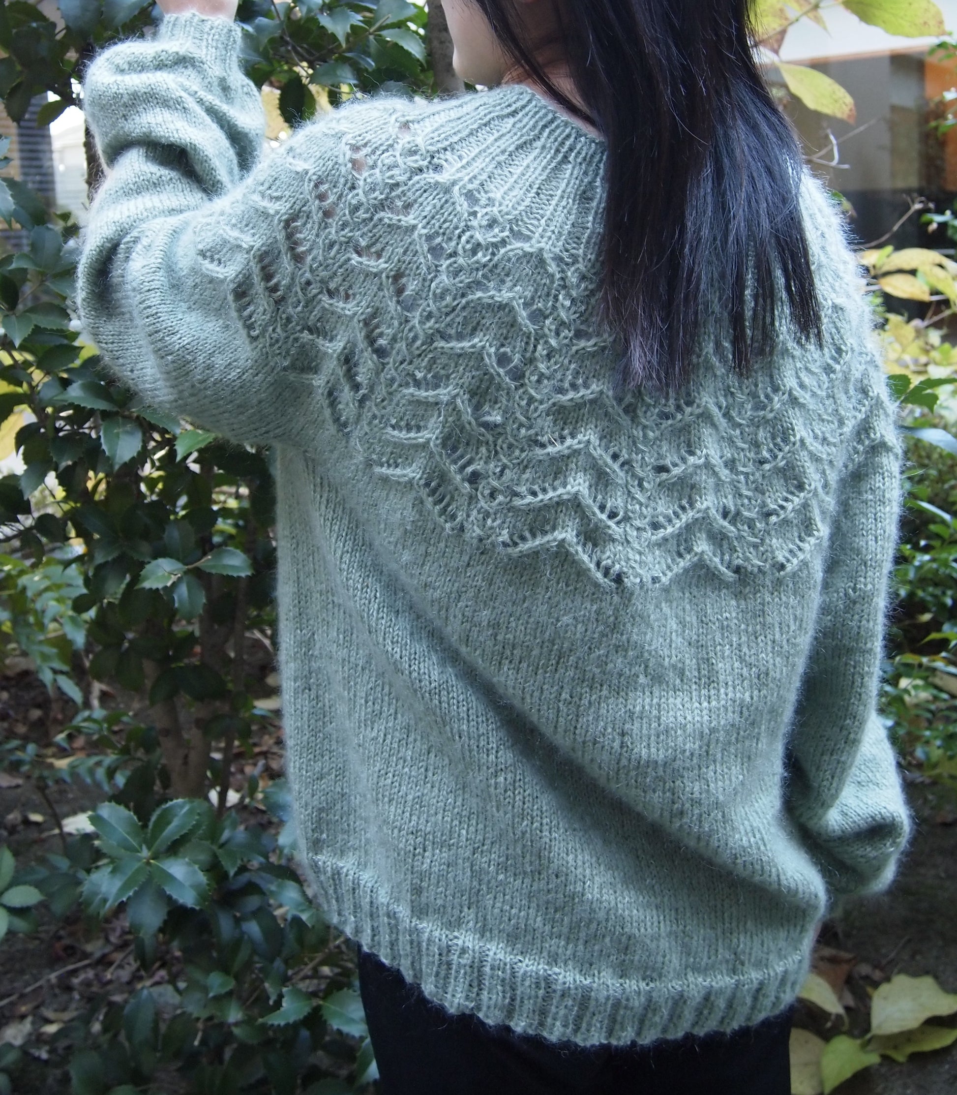 後ろ身頃と前身頃は輪で編み、袖は別に編んだ後、すべてを合流させてヨーク部分を輪で仕上げます。ヨークではレース模様と減らし目を組み合わせ、全体のシルエットを整えていきます。工程が整理されているため、作業の流れを把握しながら落ち着いて進められます。