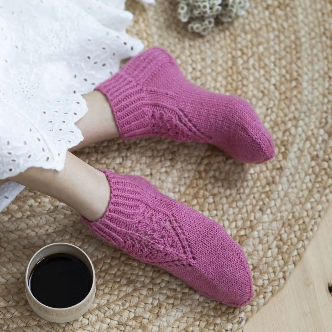 シンプルな透かし模様が施された甲部分は、メリヤス編みによる滑らかな仕上がりで、足に優しくフィットします。透かし模様によって見た目の軽やかさが増し、シンプルながらも洗練されたデザインです。つま先の減らし目は「2目一度」の技法を使用しており、初心者の方でも取り組みやすい設計になっています。ナチュラルな形で仕上げることで、快適な履き心地を実現しました。